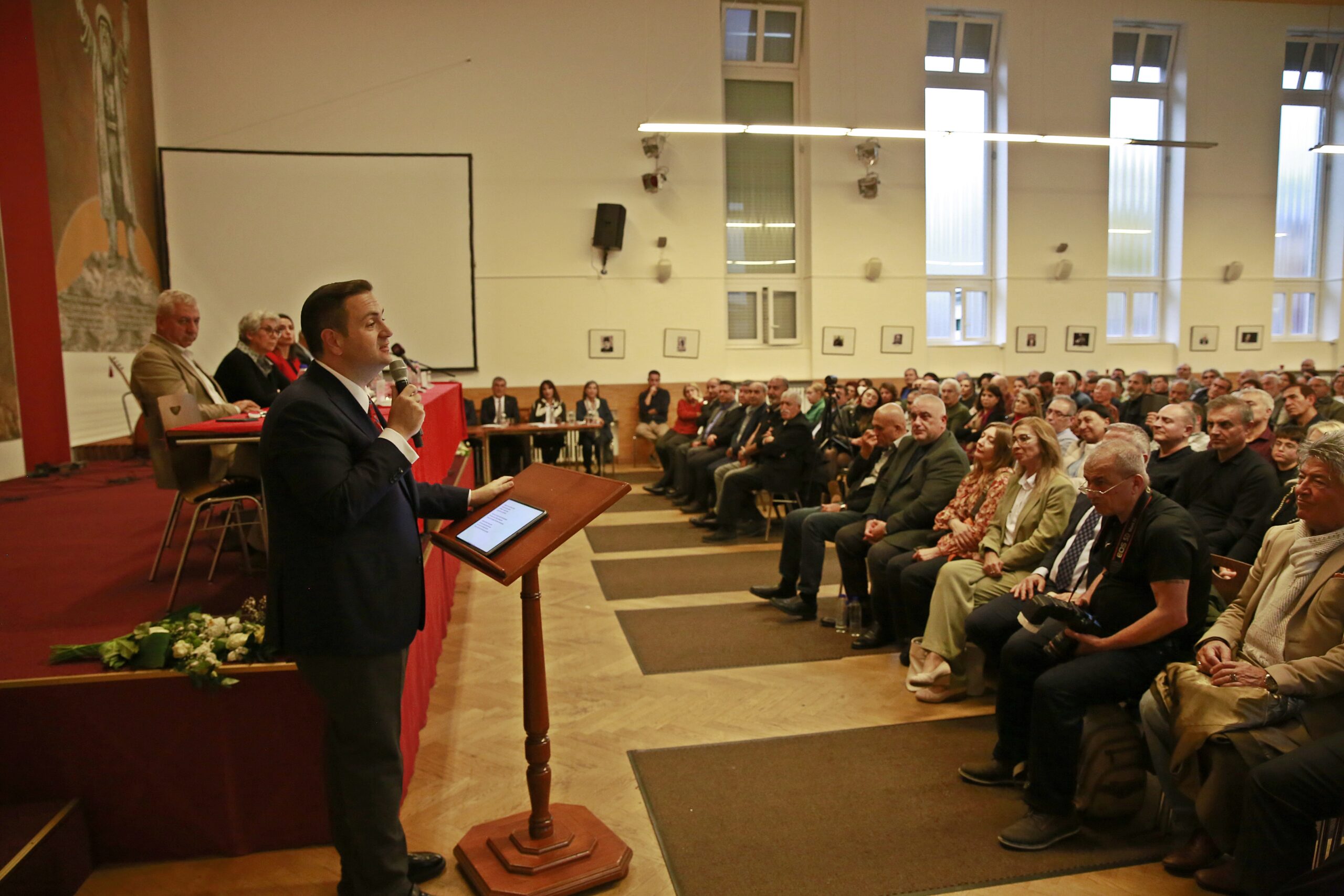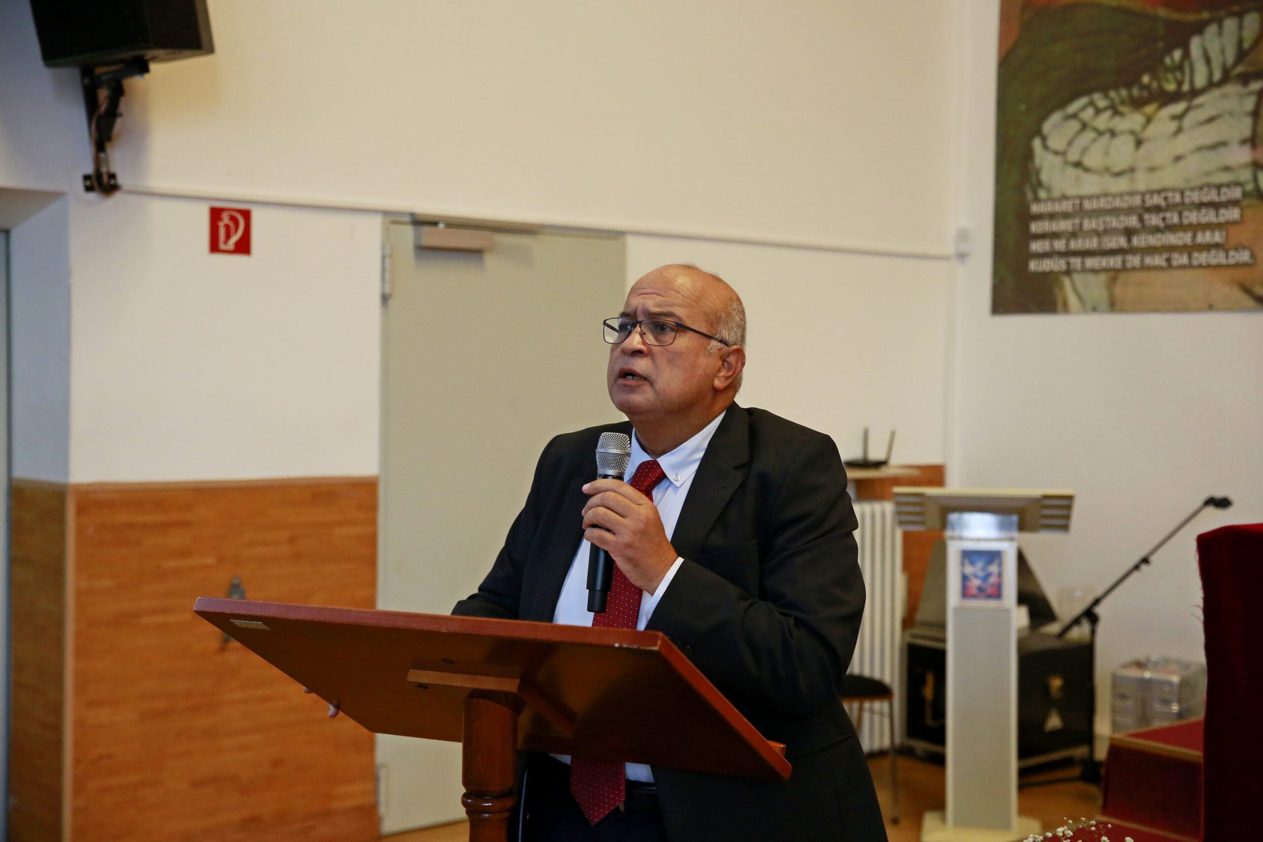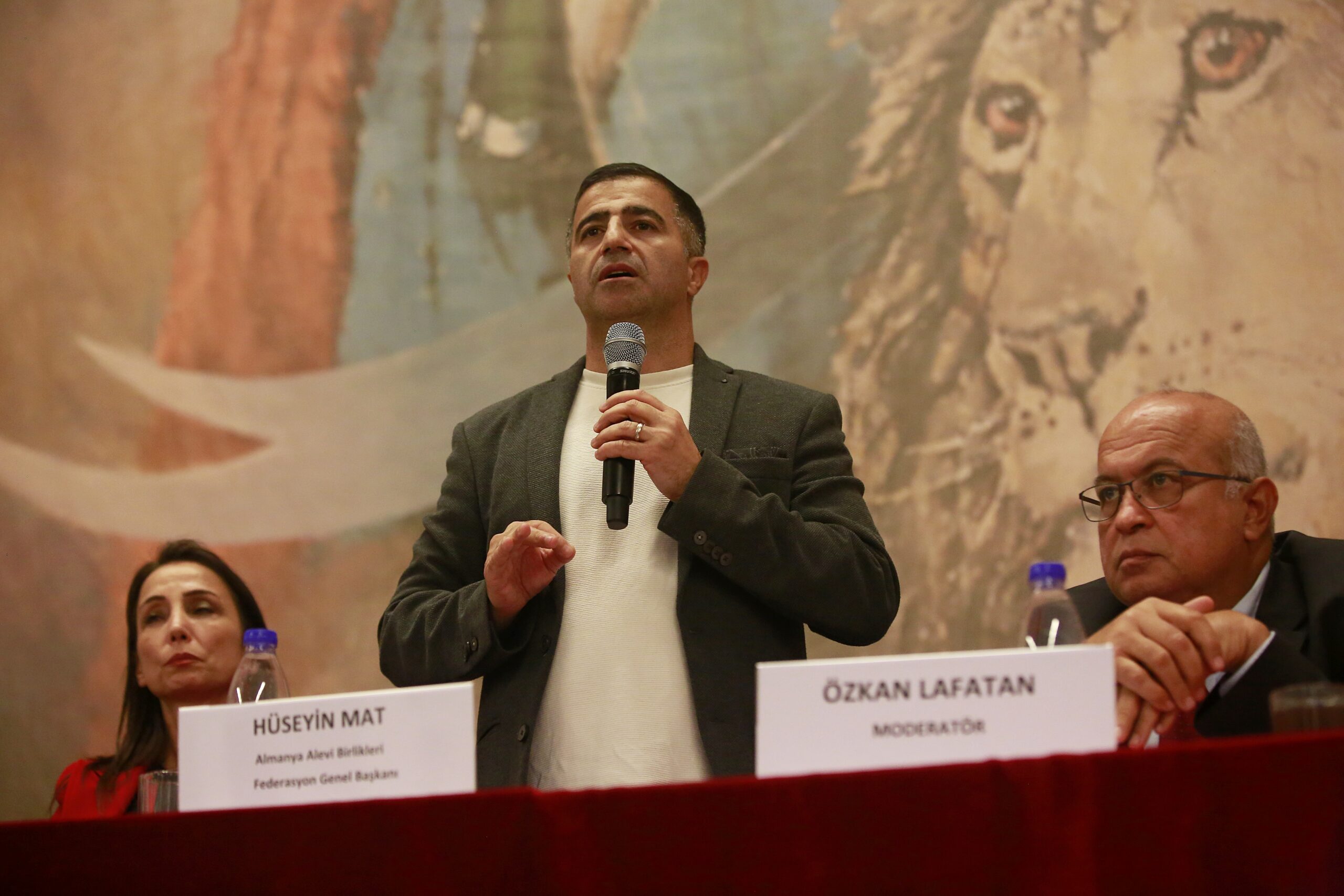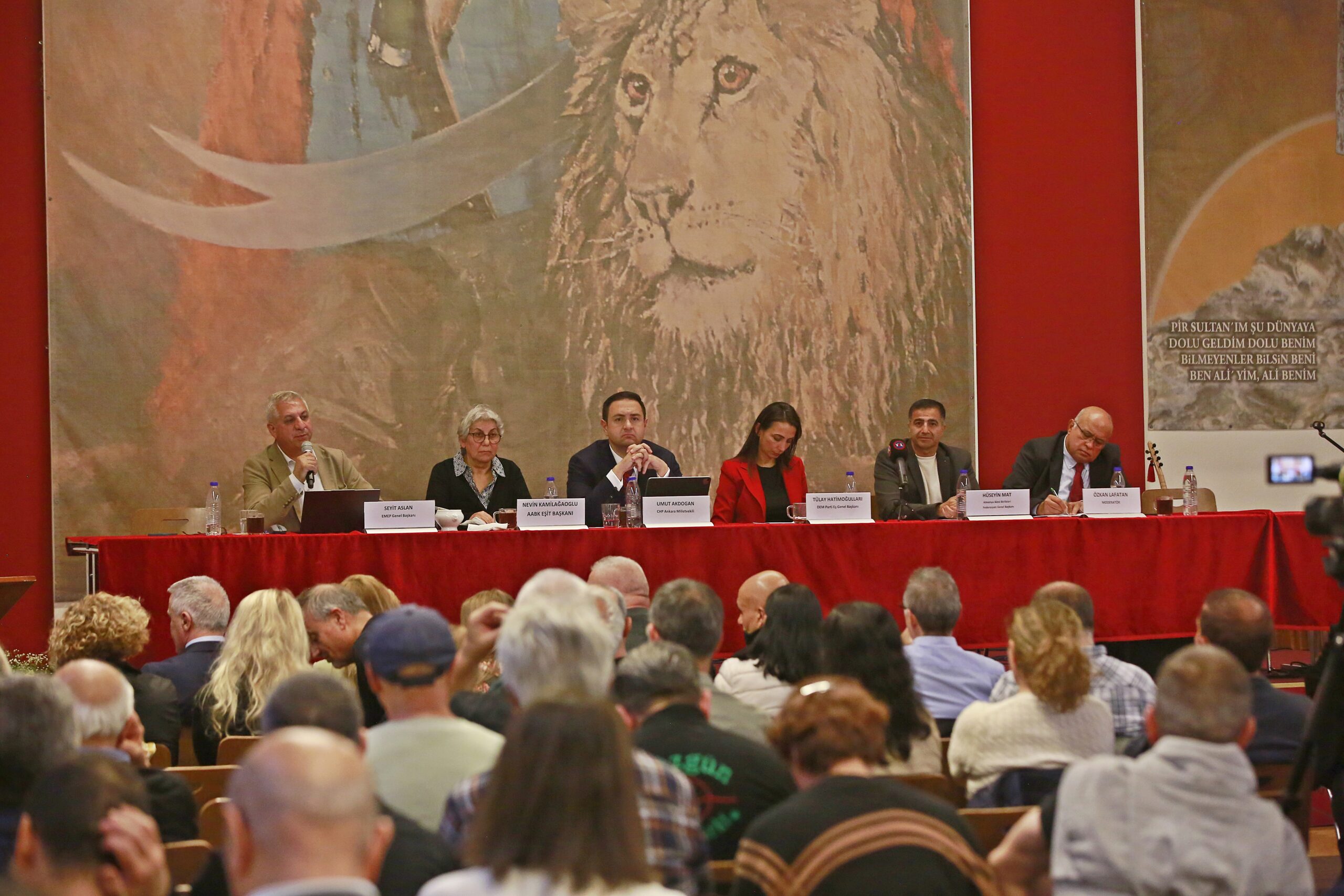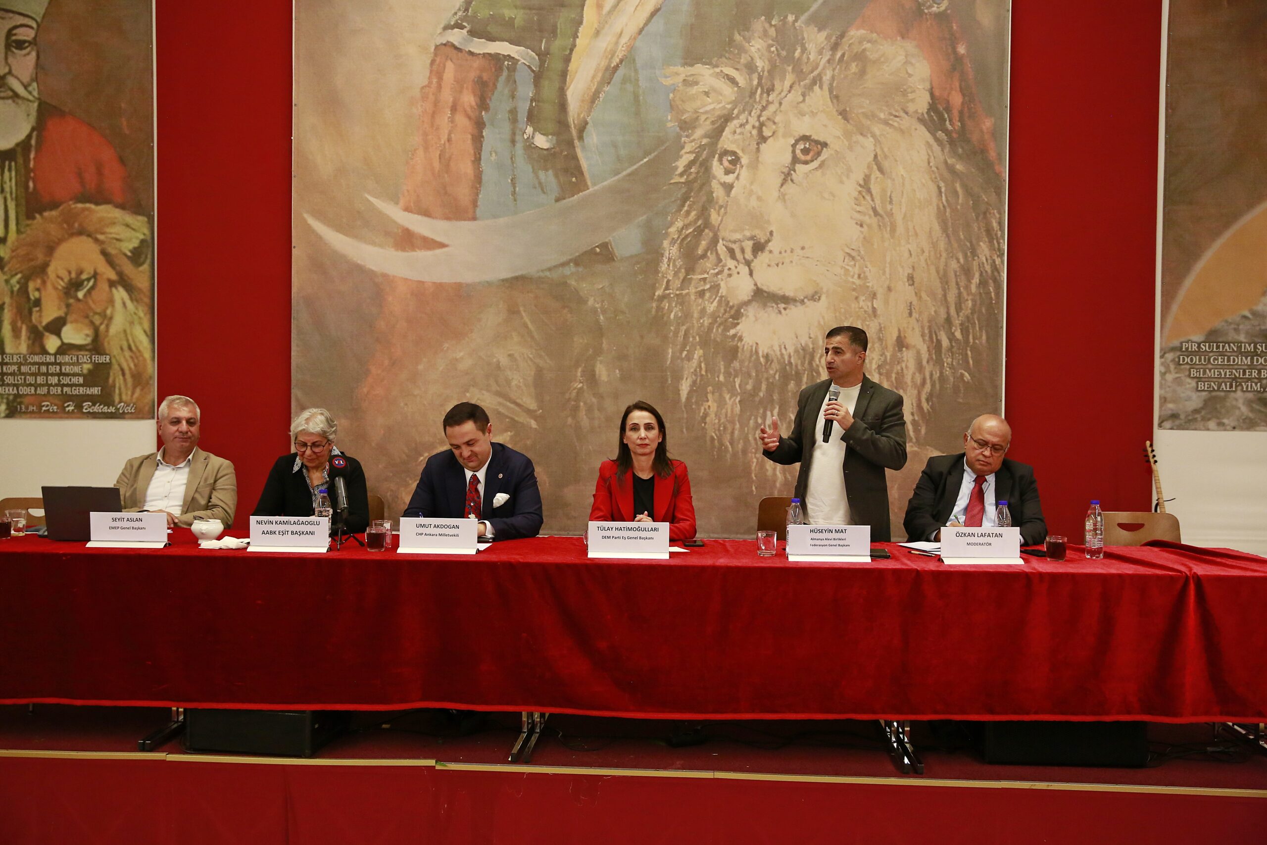 Kamilağaoğlu’ndan sonra son olarak sözü AABF Genel Başkanı Hüseyin Mat aldı. Türkiye’de bir seçim olduğunda veya önemli bir süreç başladığında, herkes Alevilere yönelip şu soruları sorar: “Aleviler ne düşünüyor? Ne yapmak istiyor? Ne yapacak?” Bu sorularla sık sık karşılaşıyoruz.” Diyen Mat konuşmasında şu başlıklarla devam etti: “Ancak Aleviler sadece Alevi örgütlenmeleri içinde mücadele eden bir topluluk değildir. Örneğin, Seyit Başkanım, Alevilik var mı? Evet, var. Peki neden sordum? Bakın, CHP, DEM, EMEP her yerde Aleviler. Hak ve demokrasi mücadelesi verilen her alanda Alevileri görebilirsiniz. Sadece Cemevleri veya Alevi örgütleriyle sınırlı değiller. Kuşları koruma derneğine gitseniz bile orada Alevilerle karşılaşırsınız. Çünkü Alevi inancının temelinde zalime karşı mazlumun yanında durmak, mücadele etmek ve herkesin hakkını korumak vardır. Doğal olarak, böyle bir inanca sahip olan bir topluluk; doğa, çevre, kadın, gençlik veya herhangi bir hak mücadelesi verilen yerde mutlaka bulunur.