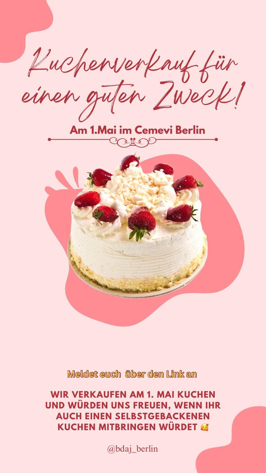 Wir verkaufen Kuchen für einen guten Zweck und würden uns sehr freuen, wenn ihr einen selbstgebackenen Kuchen mitbringen könntet!