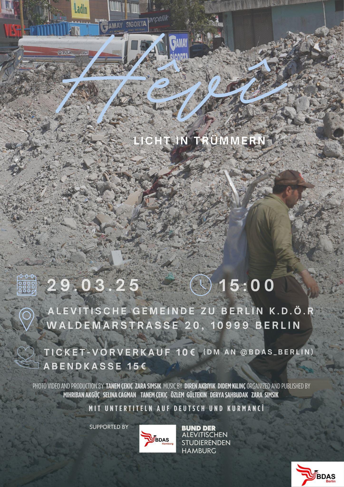 BDAS Hamburg tarafından hayata geçirilen Hevî – Licht in trümmern projesi, depremzedelerin kendi hikâyelerini anlatmalarına olanak tanıyan bir film ve fotoğraf çalışmasıdır. Depremden etkilenenlerin sesi olmaya devam eden bu proje, yaşananları unutturmamak ve dayanışmayı büyütmek için Berlin’de de sizlerle buluşuyor.