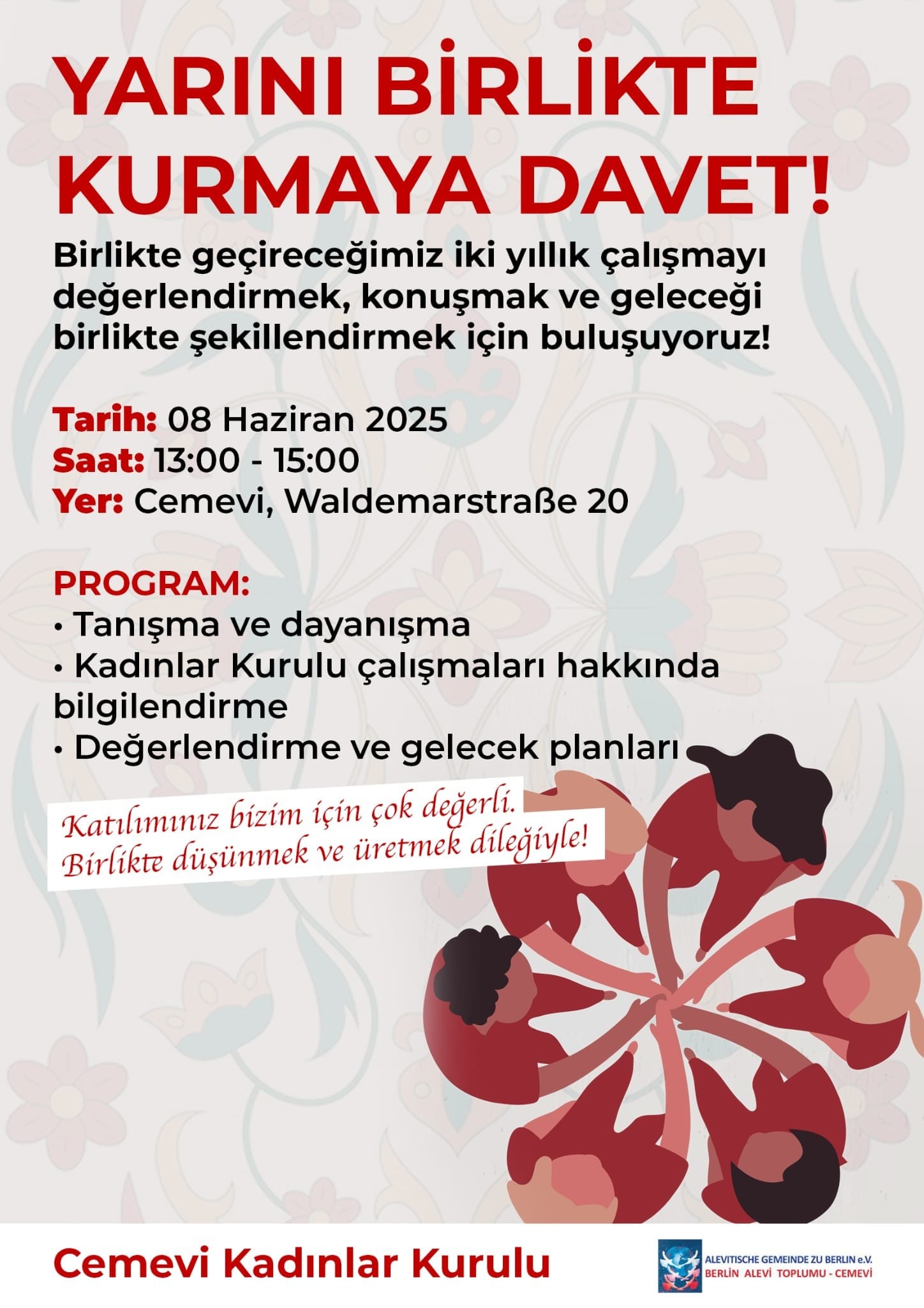 Kadınlar Kurulu olarak hepinizi 8 Haziran’da Cemevinde bir araya gelmeye davet ediyoruz. Bu buluşmada, iki yıllık çalışmalarımızın temelini değerlendirecek ve geleceğe dair projelerimizin yol haritasını birlikte oluşturacağız.
