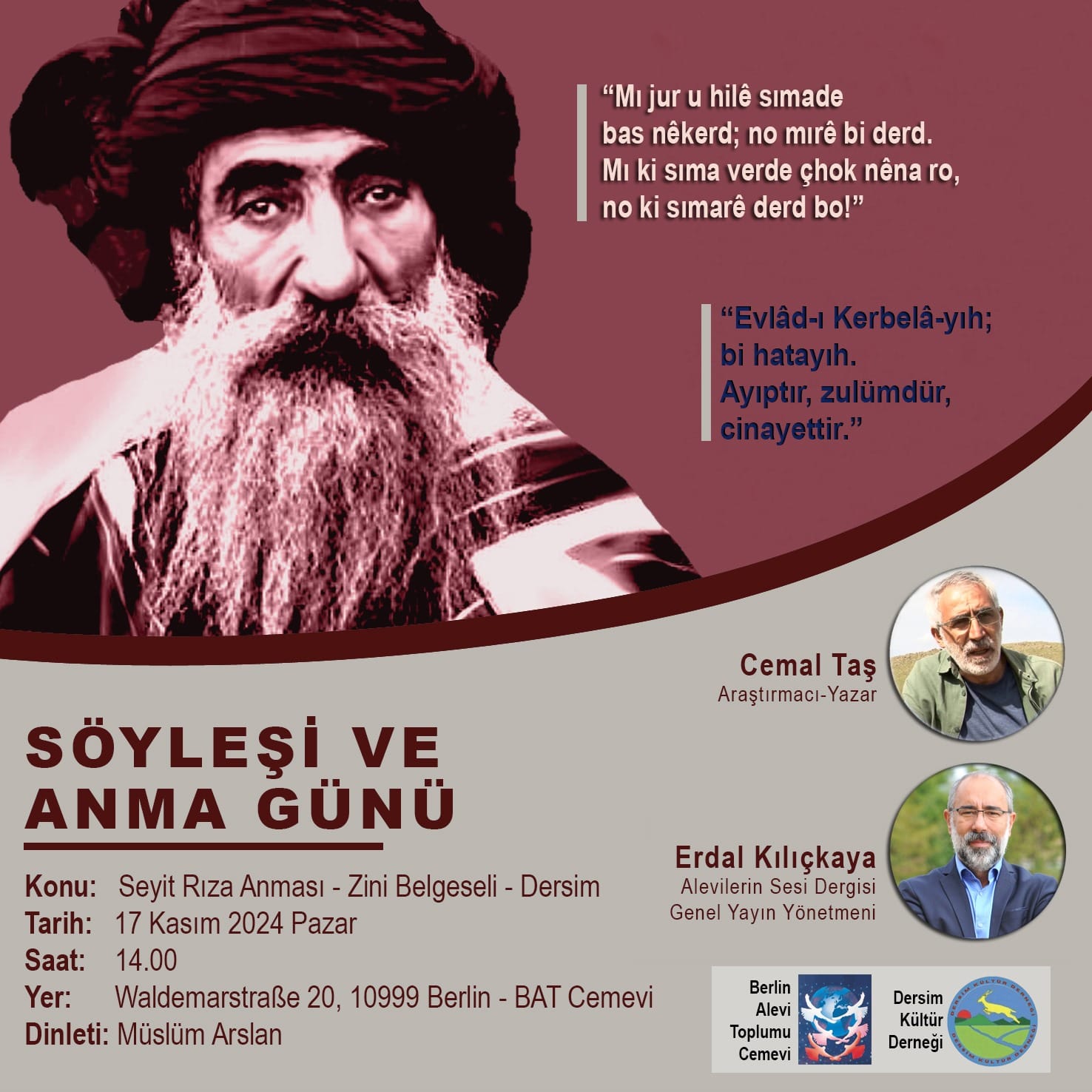 Berlin Alevi Toplumu – Cemevi ve Dersim Kültür Derneği olarak, 1938’de idam edilen Seyit Rıza ve arkadaşları nezdinde Dersim katliamında yitirdiğimiz canları anacağız.